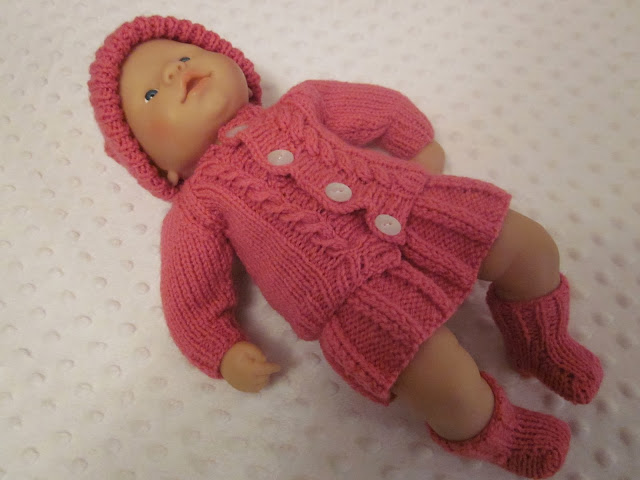 This set consist of a skirt knitted in a pleated rib pattern and a cardigan knitted in a stocking stitch pattern with a cable pattern up the front borders. The cardigan fastens with buttons down the front. This set is completed with a hat knitted in a stocking stitch and cable pattern and socks knitted in a stocking stitch pattern This set as being made to fit My First Baby Annabel at 14 inches long but is suitable to fit any other dolls a smiler size. This outfit is available "Dusty Pink"